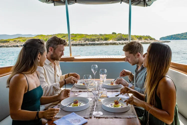 Kata is one of the very few remaining traditional wooden motor boats once central to Korčula’s local shipbuilding tradition. Lovingly restored, she now offers a refined and intimate way to explore the surrounding islands, combining time on the water with attentive service and thoughtful culinary touches.